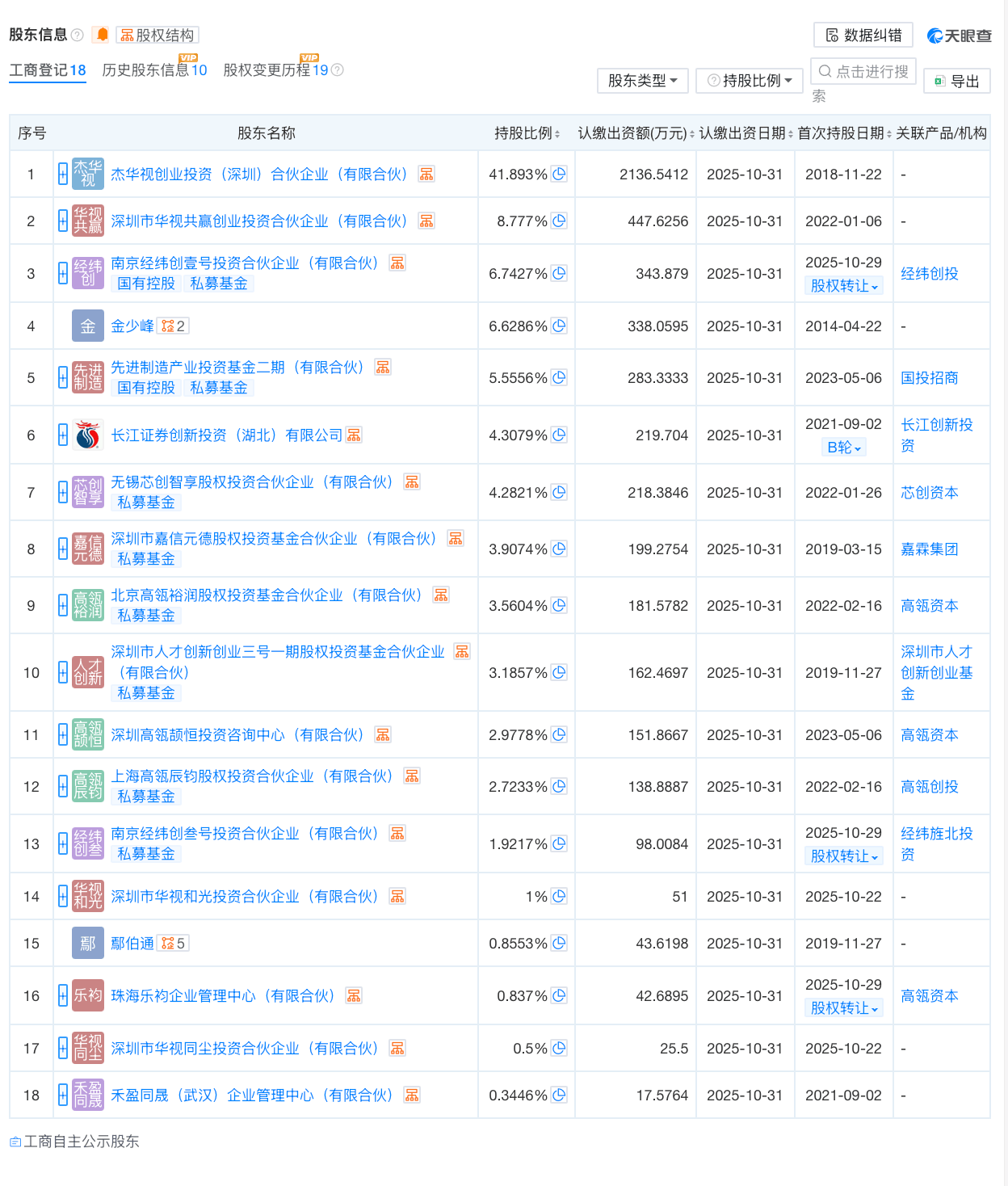 天眼查App信息显示,金少峰直接持有深视智能6.6286%股份;杰华视创业投资(深圳)合伙企业(有限合伙)持股41.893%,系控股股东;深圳市华视共赢创业投资合伙企业(有限合伙)持股8.777%。