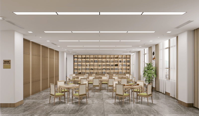 内公共活动空间丰富多样,宛如一座文化娱乐的宝库。健身房里,长者可以挥洒汗水,保持健康体魄;乒乓球室、台球室中,切磋球技,增进友谊;书法室、绘画室里,挥毫泼墨,抒发情感;社团活动室、党员活动室是交流思想、开展活动的理想场所;理发室让长者时刻保持整洁形象;冥想室为心灵提供宁静的港湾;手工室激发创造力,享受手工乐趣;麻将室、舞蹈室充满欢声笑语;多功能厅可举办各类大型活动;图书馆里书香四溢,满足阅读需求;厨艺学堂传授烹饪技巧,享受美食乐趣;玉兰剧场、大师工作室、玉兰书苑更是为长者提供了展示自我、学习交流的平台。