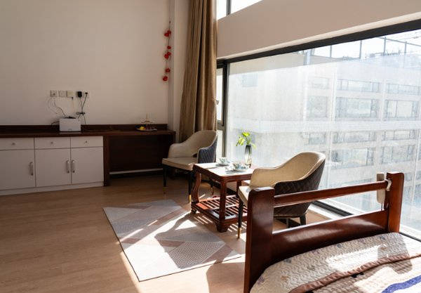 与商业综合体世界之花和石榴公园相邻,五千余平米的空间内,适老化居家设施兼顾公共活动需求与生活隐私。星级酒店标准的房型丰富,包括单人间、双人间、家庭套间等,其中家庭间专为两老一残家庭设计,让智残子女与年迈父母能在独立空间同享受专业照护。业内首创的整体全新风 PM2.5 循环过滤系统,24 小时守护空气清新,搭配 LG 静音地面、美标智能马桶等先进设施,细节处尽显贴心。电梯直达的 700 平米屋顶生态花园,由长者参与设计管理,即便乘坐轮椅也能亲近自然、收获果蔬。