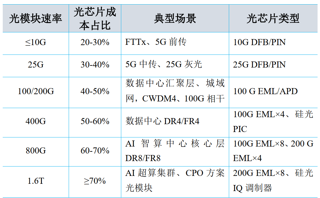 光芯片是光模块的 “心脏”,价值占比随光模块速率提升而显著放大。光模块速率自 1998 年的 1.25Gbit/s 持续迭代,如今 800G 已成智算中心标配,1.6T 成新方向,3.2T 及更高规格也在研发中。